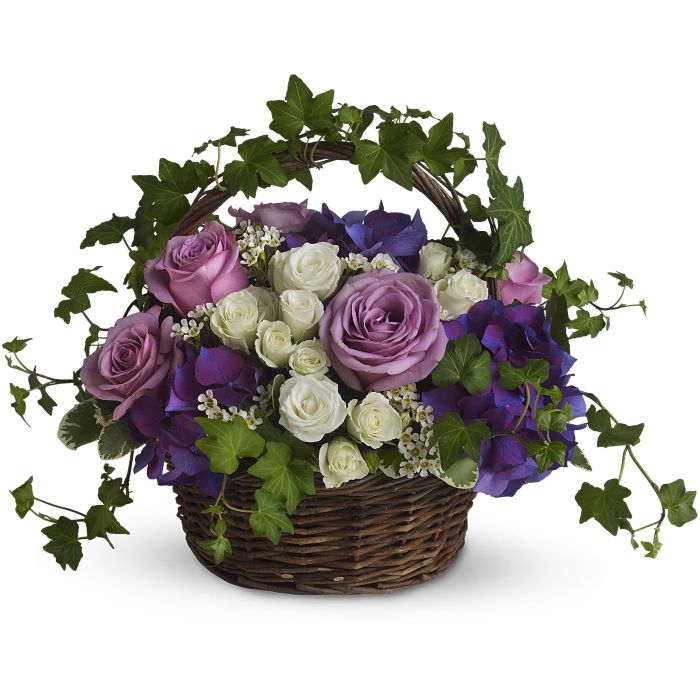 Lush flowers to celebrate a full life. This beautiful basket of flowers for a funeral or home evokes the natural beauty of life with purple hydrangeas, lavender and white roses and winding green ivy.