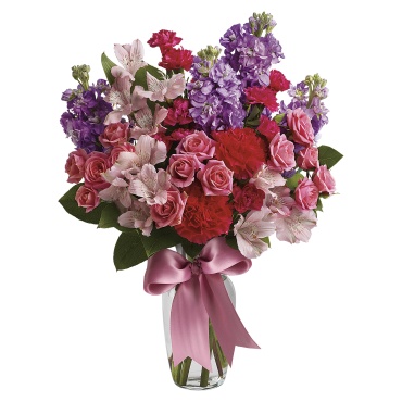 Send her on a dreamy stroll through a garden with this perfect-for-any-occasion bouquet. Soft lavender and pink flowers delight with a sweet smell; a pink ribbon adds to the feminine look of this traditional arrangement.
